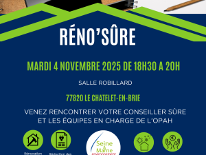 la CCBRC et Seine-et-Marne Environnement organisent le Mardi 04 Novembre 2025 à 18h30 une animation RENO’SURE dans la salle Robillard du CHATELET EN BRIE.