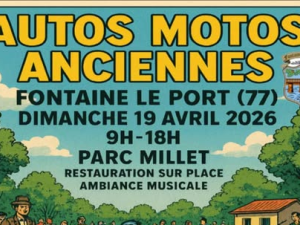 Evénement Manifestation véhicules anciens Regroupement de véhicules anciens sur la commune de Fontaine le Port 19 Avr 2026 Time: 09h - 18h Parc Millet Courriel Mairie Localiser Choice of plan Précédent Retour à la liste Suivant